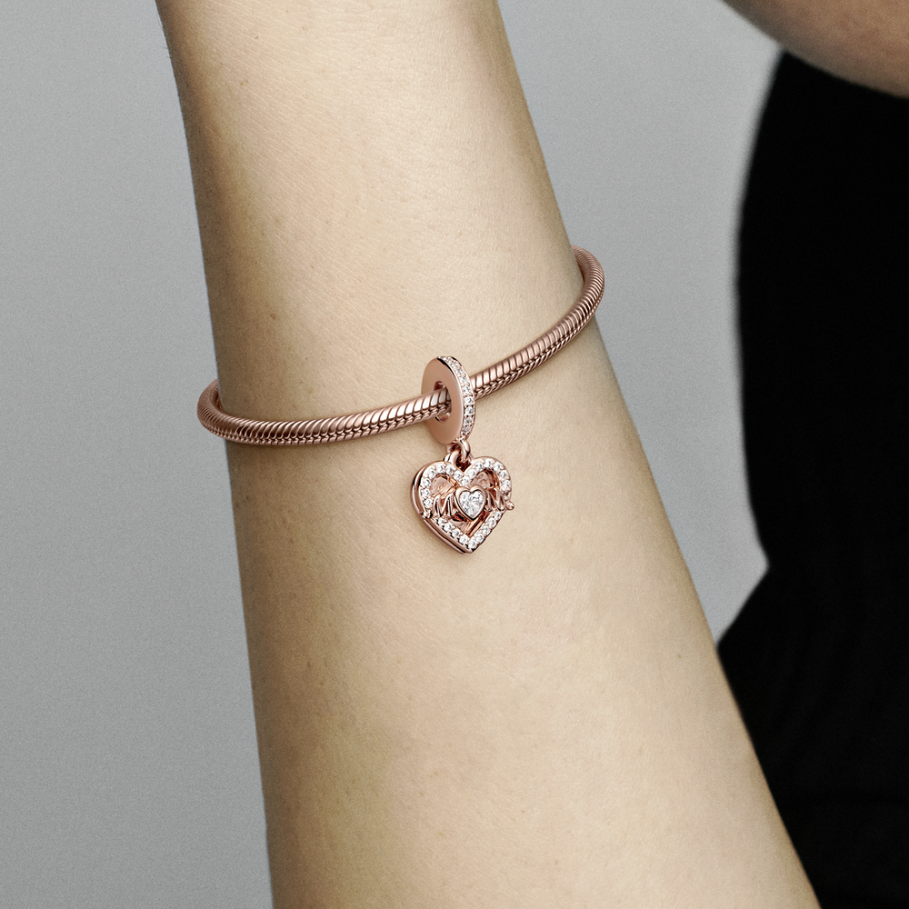 Celebrate the bond of love you share with the Heart & Mum Dangle Charm. This heart-shaped double dangle charm is finished in warm 14k rose gold plating with sparkling pavé on the bail and outlining the front dangle. The front dangle has the word "M♥M" in openwork script with a heart-shaped stone forming the central letter. The back dangle is engraved with the message "All of me loves all of you" in a repeated pattern. A heartfelt jewellery gift for the mother figure in your life.