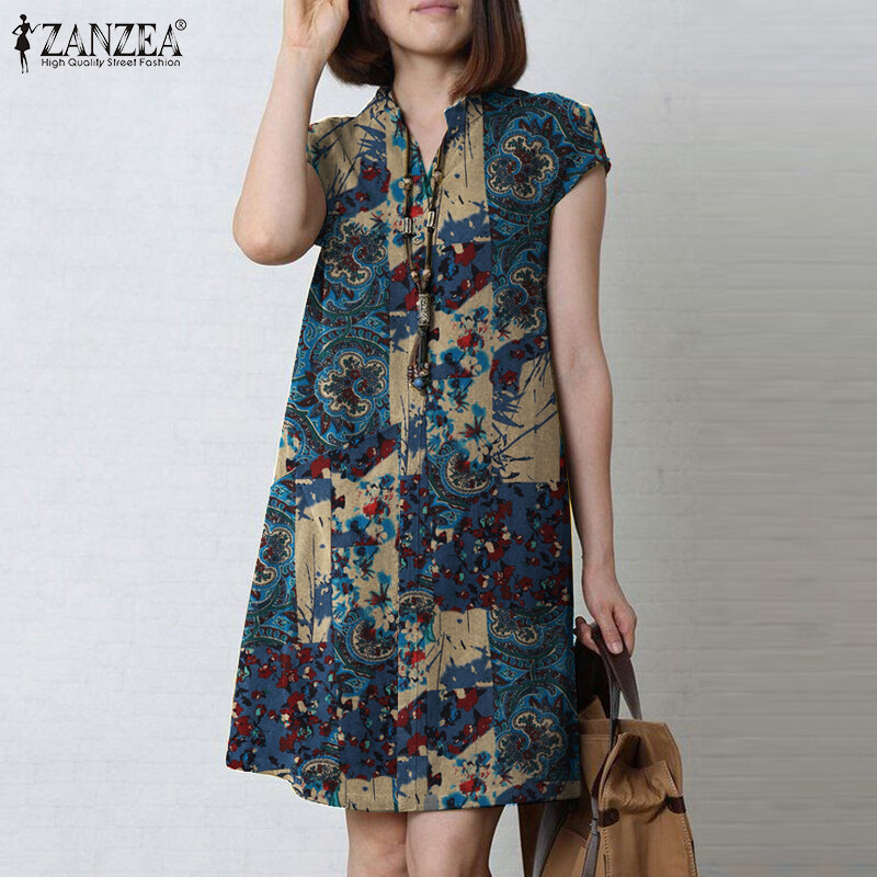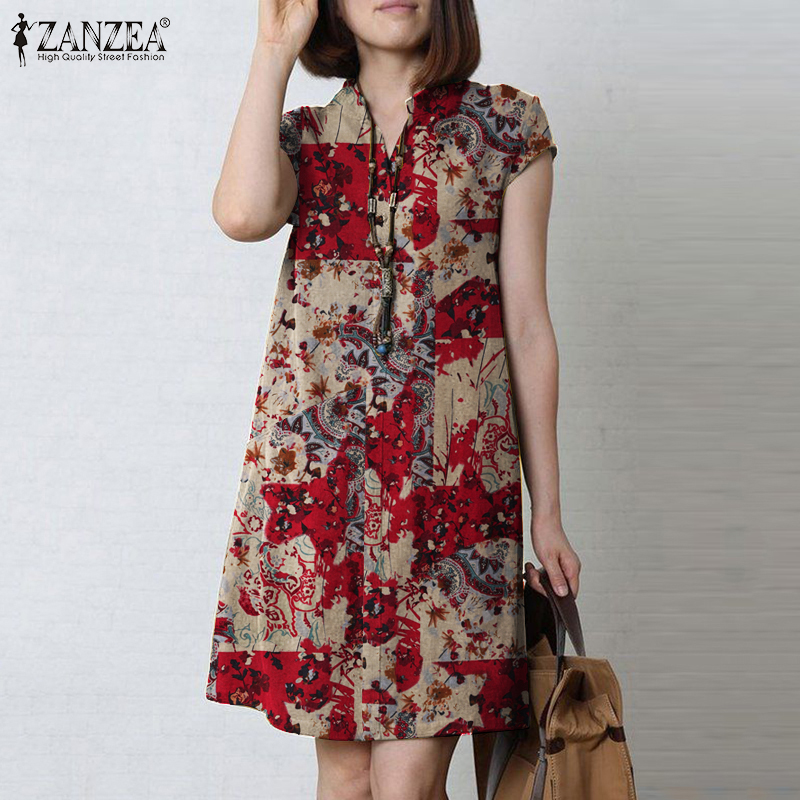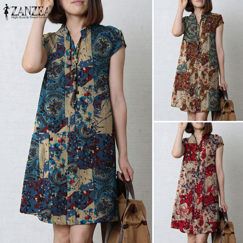 ZANZEA Women Bohemian Floral Printed V-Neck Dress Holiday Casual Short Sleeve Sundress #7